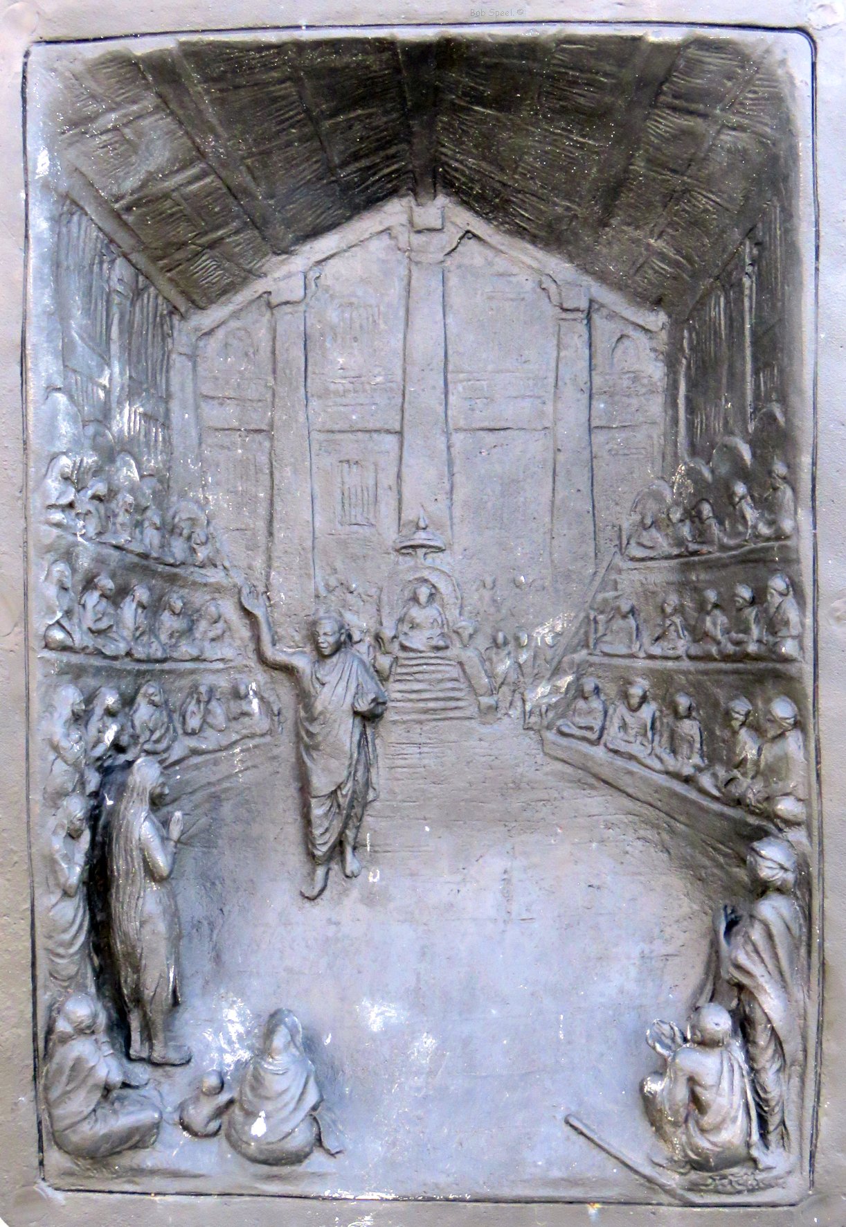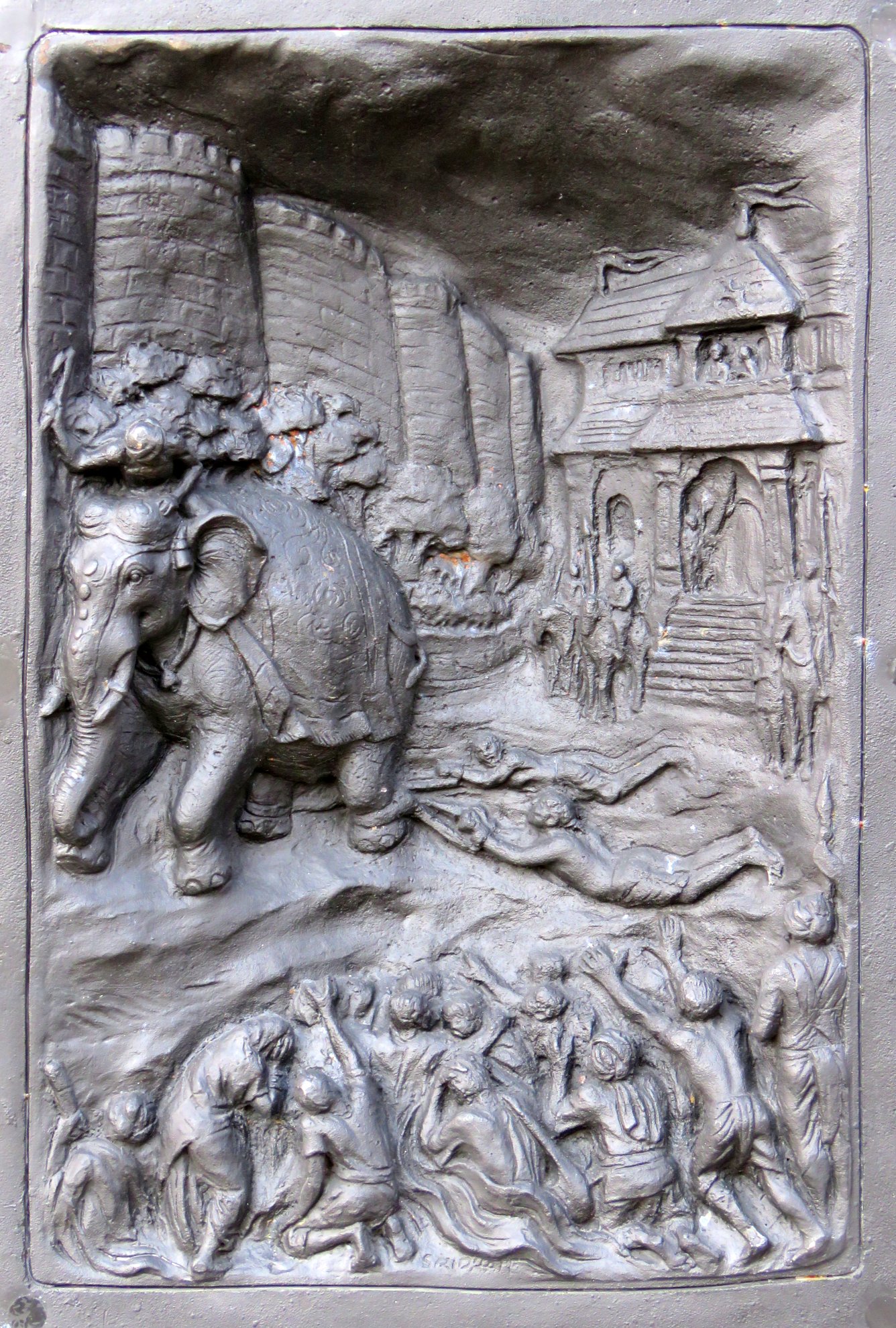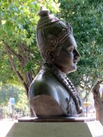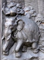 In the centre of this space is a modern bust of a 12th Century Indian philosopher who apparently espoused equality and a move away from the caste system, called Basaveshwara. The piece was commissioned in 2011 by the Mayor of Lambeth at the time, and a local foundation he set up, and the government of Karnataka, India, to highlight his work promoting a similar democratic ideal to that of British democracy; it was unveiled rather later, in 2015. While the subject has no obvious links to Lambeth, additional representational statues in London are generally to be welcomed, and it is an interesting example of modern Indian sculpture in the capital. The bust is highly finished, in a bland, symmetrical composition staring straight ahead, with ceremonial headpiece and necklaces, over an unobtrusive light garment. On the sides of the base are a pair of relief panels, one showing presumably Basaveshwara declaiming to hall full of mostly seated figures, and the other an elephant going past the walls of some castle, a building with cavalry behind, writhing figures in the foreground. The elephant is commendable. The whole piece was made by sculptor Sridhara Murthy. Other elephant sculpture, including another Indian one, on this page.