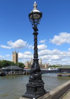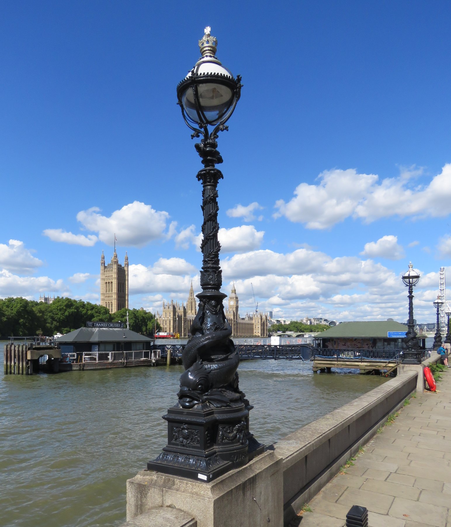 Along with these two bronze pieces, we have cast iron street furniture contemporary with the creation of the Embankment. Firstly, the characteristic dolphin lamp posts, found on both sides of the water, some dating from 1870, thus immediately following the completion of the Albert Embankment in 1869, the master work of the engineer Joseph Bazelgatte, supported on this side by another engineer, John Grant. The dolphins are sometimes referred to as sturgeon, and indeed their physiology is closer to the sturgeon than the dolphin, and yet these are similar to the Classical dolphins of Roman times, reproduced so often in Renaissance Italy and later.