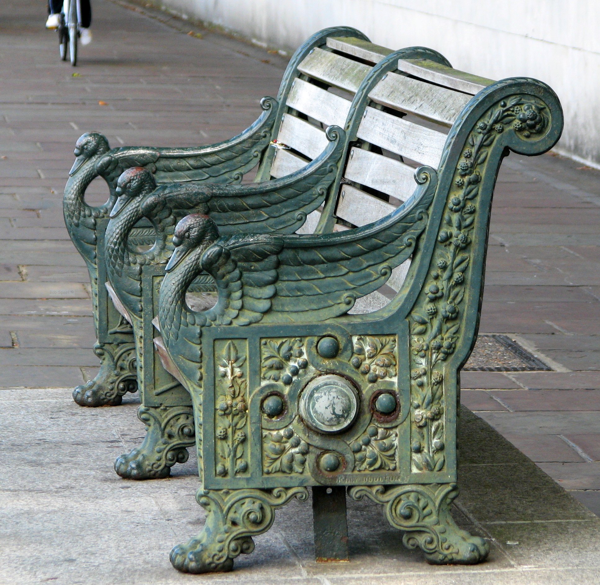 The significant architect G.J. Vulliamy was the designer, and the pieces were modelled by Charles Henry Driver. Vulliamy was also responsible for the swan and camel benches along the Embankment, with three benches here with the swan design; curiously, these benches still rest on lion's feet. His most well known works are the massive sphinxes at the base of Cleopatra's Needle on the north side (Victoria Embankment) a bit further downriver. Swan sculpture is not so widespread in England; some other examples are on this page.